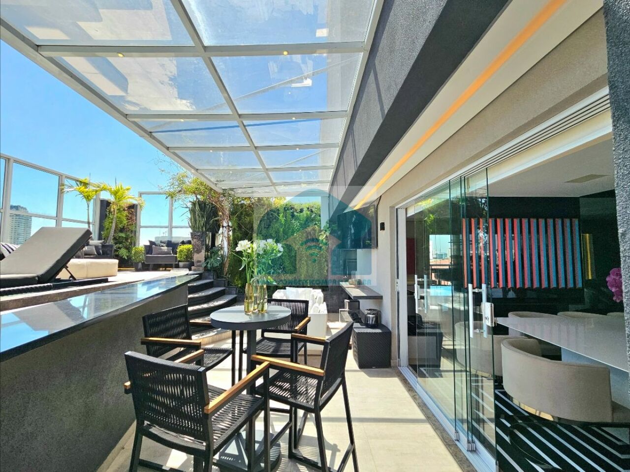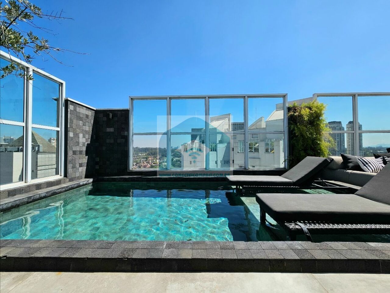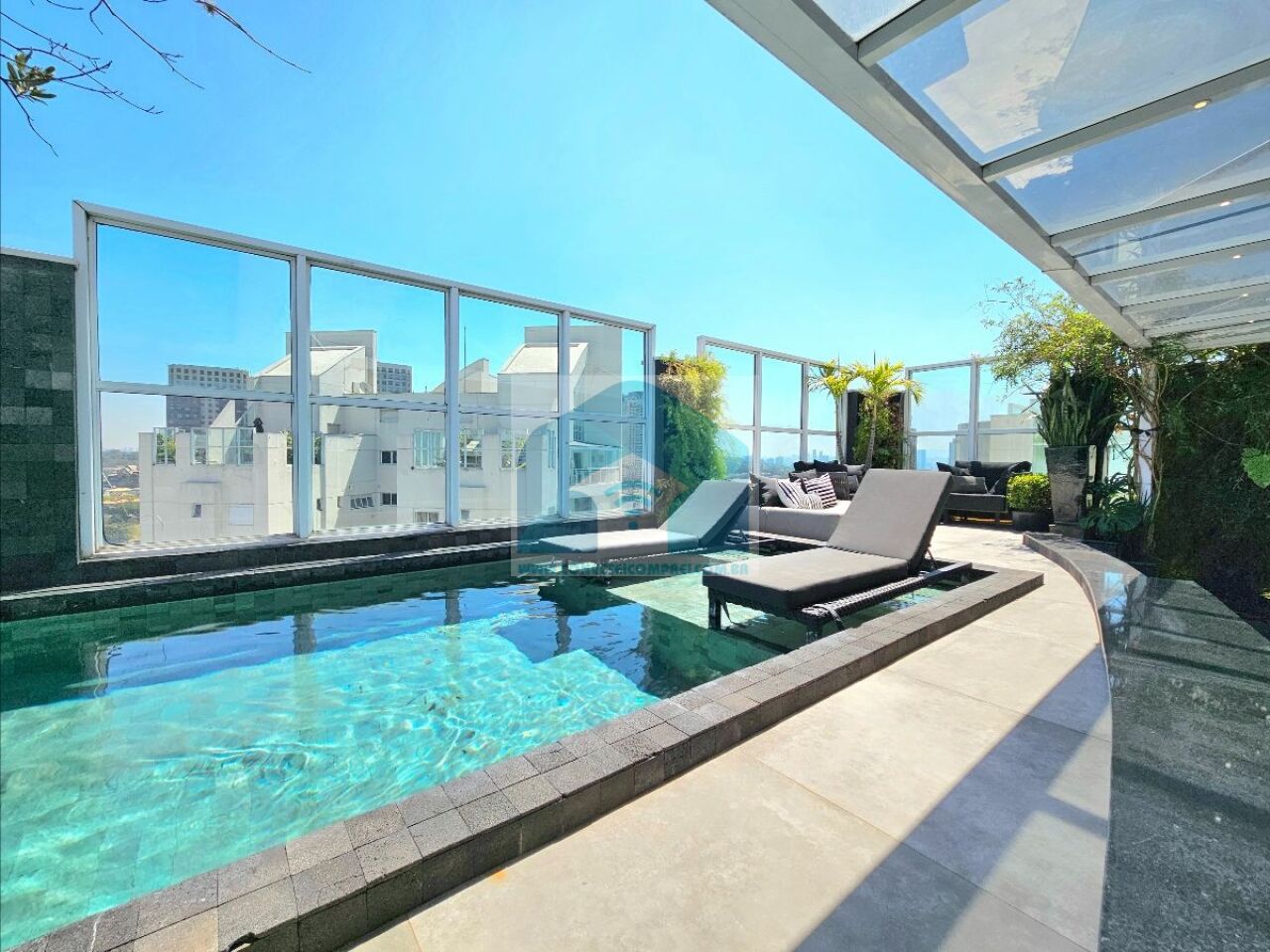 Cobertura única com piscina aquecida revestida em pedra Varanda gourm...