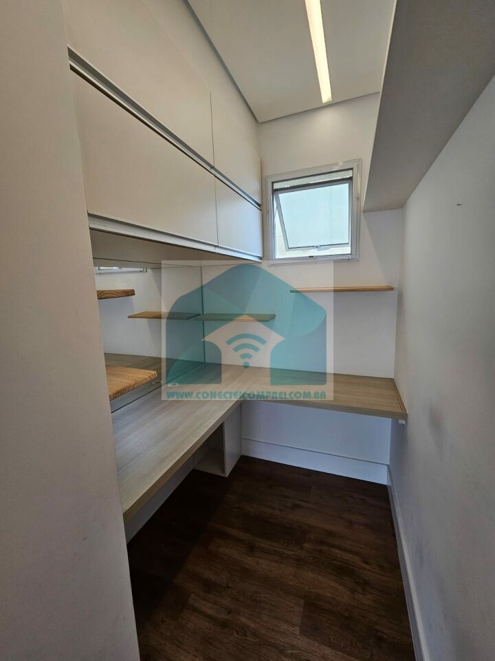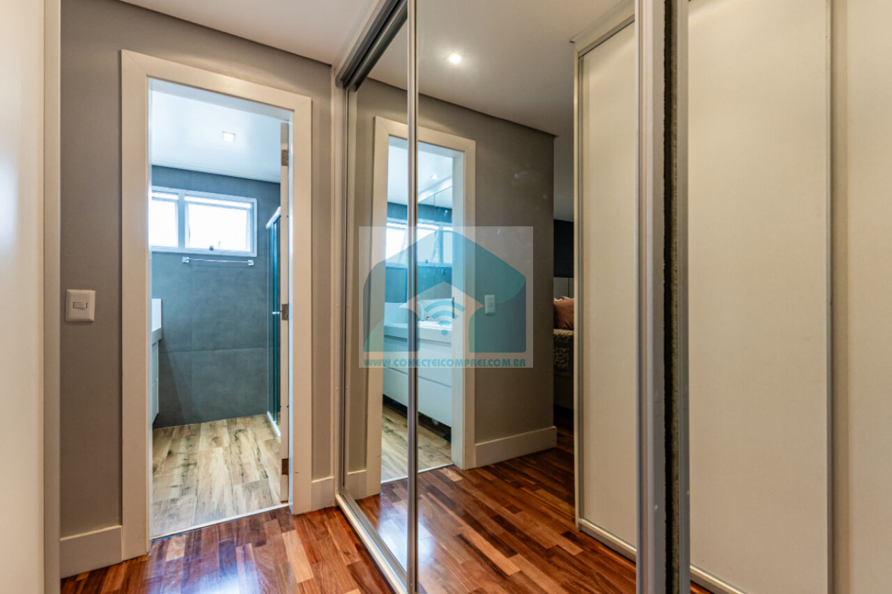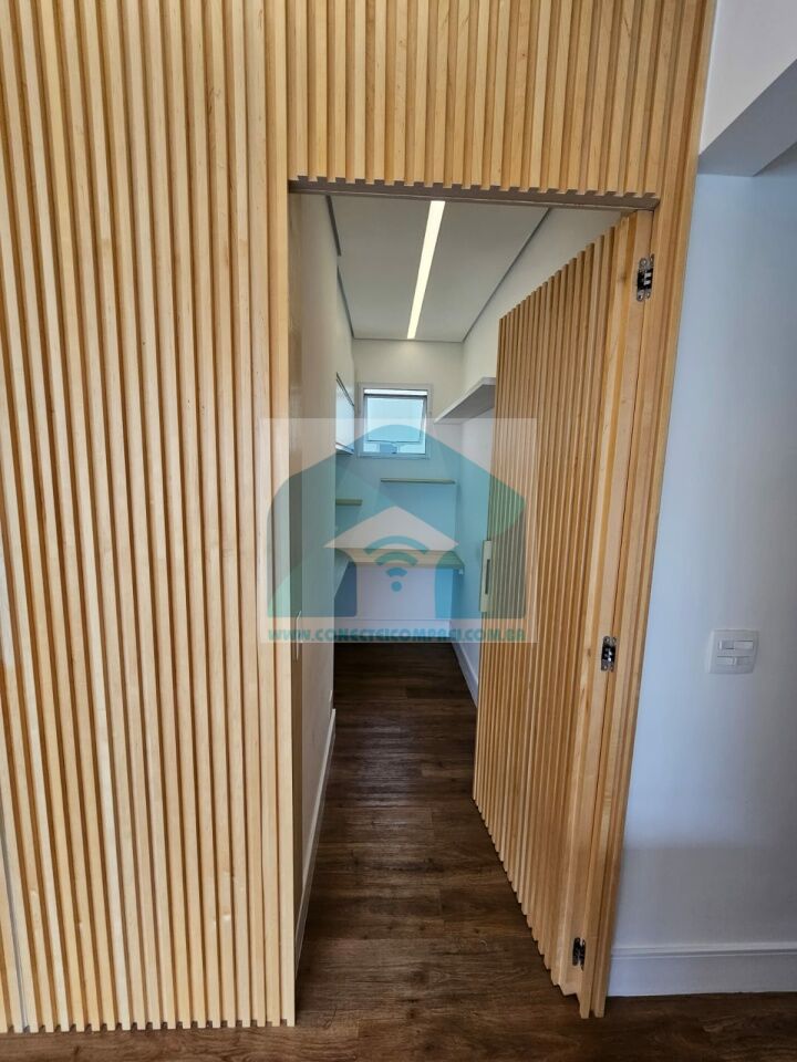 Armários embutidos com iluminação em LED e paredes revestidas em marcenaria