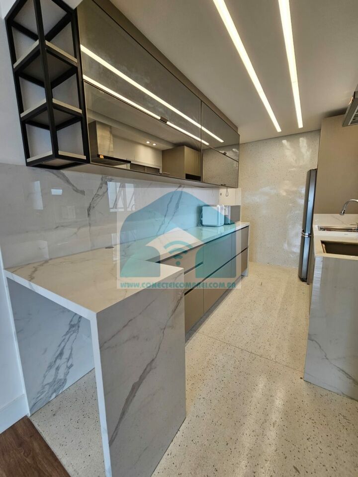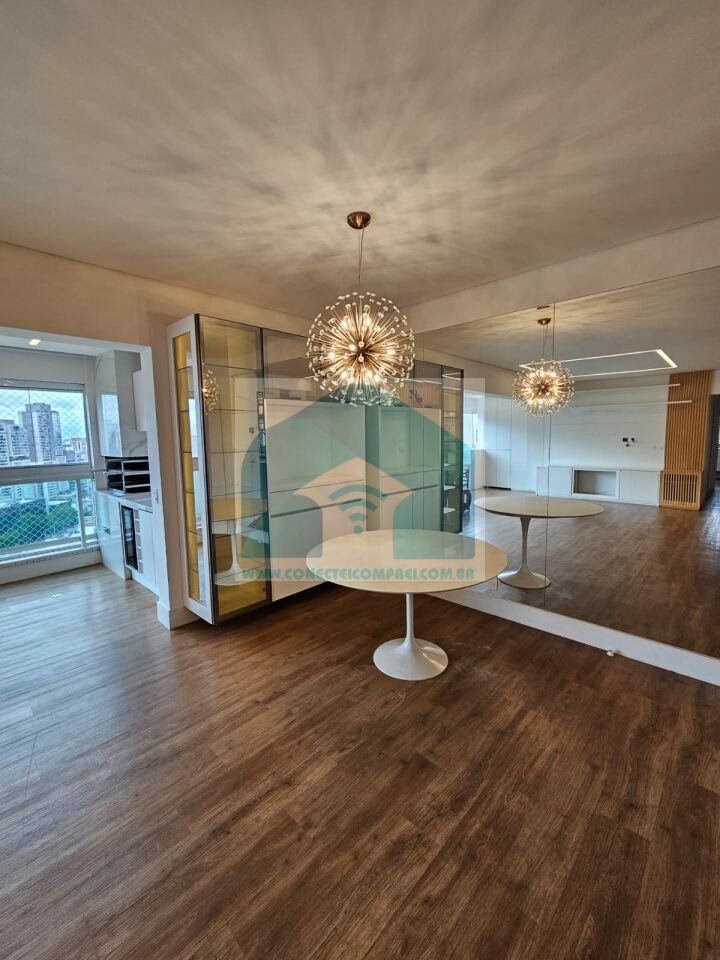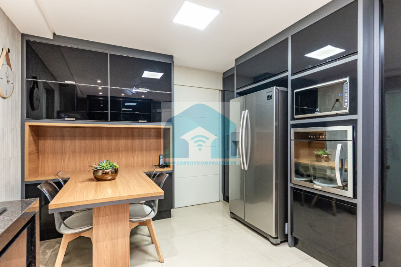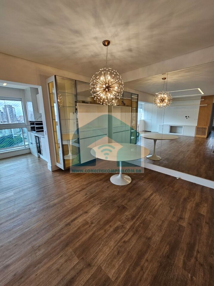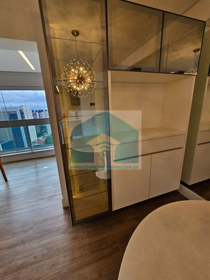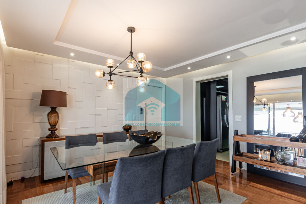 Estantes com iluminação em LED. . 2 splits ar condicionado espelhado . Papel de parede e espelhos. Infra existente do condomínio para Churrasqueira ( não colocamos a churrasqueira). Iluminação técnica com lâmpadas em LED e pendentes sobre a mesa de jantar.
