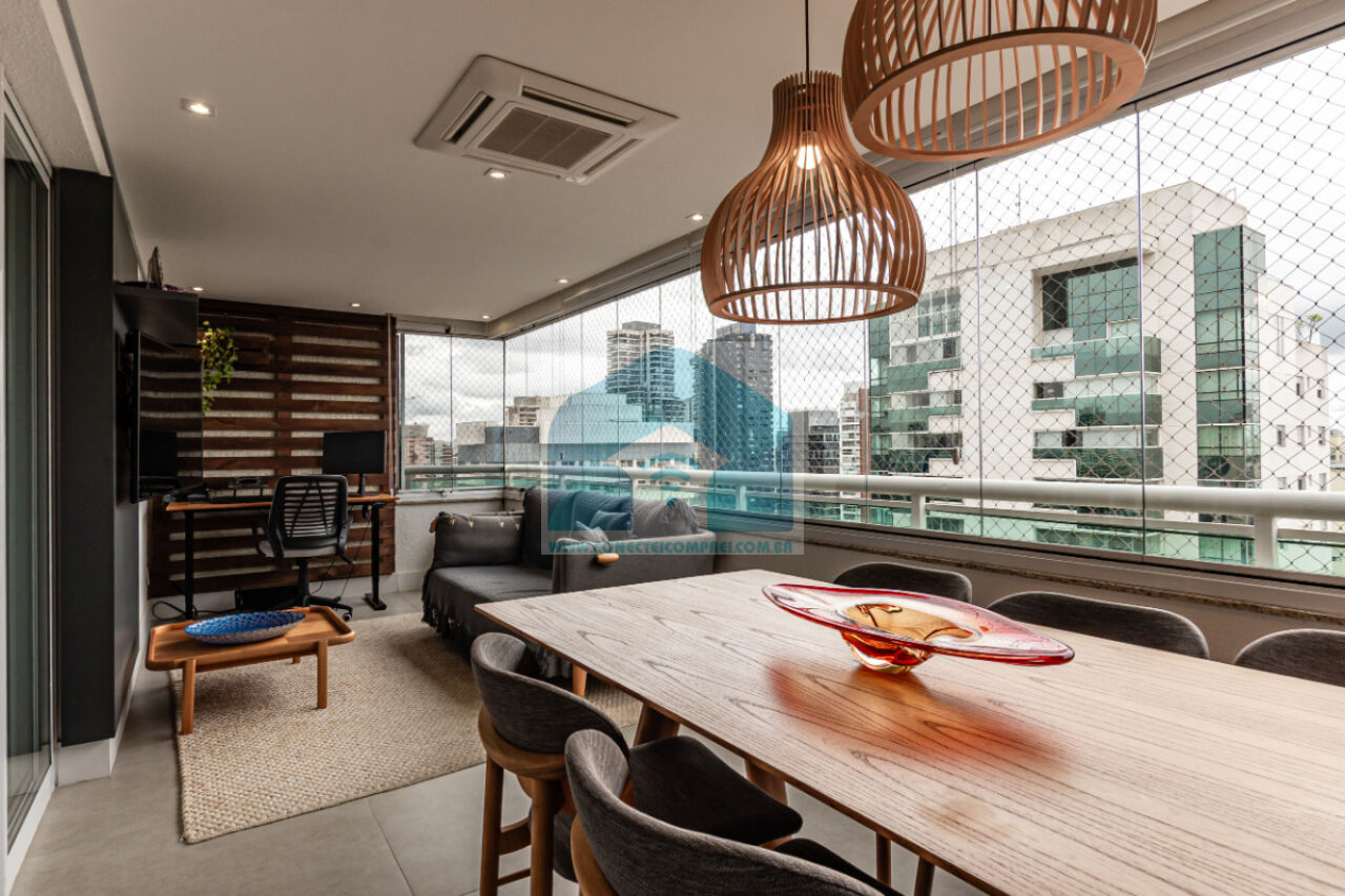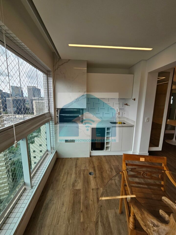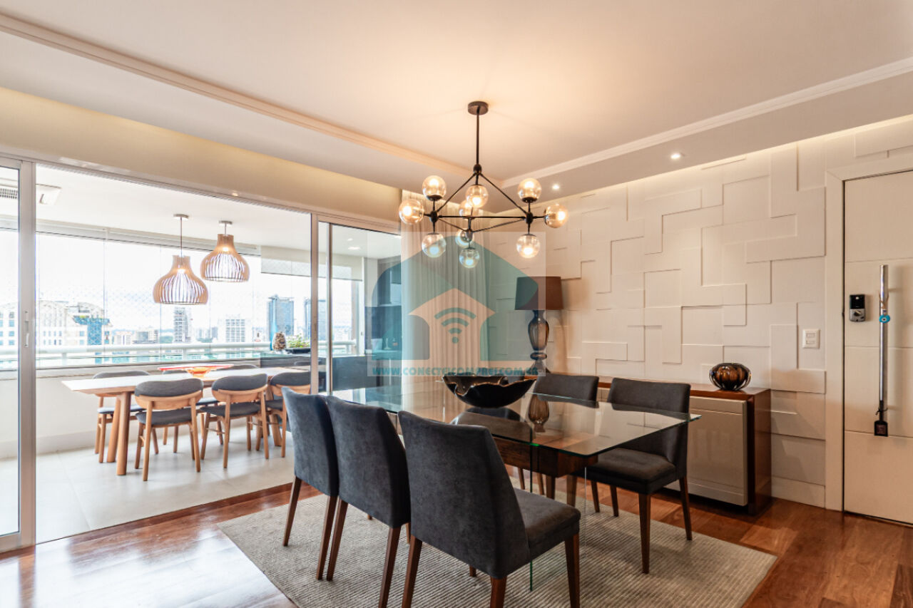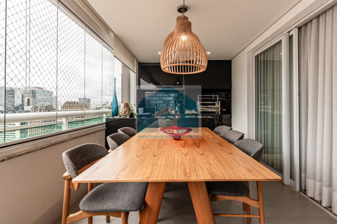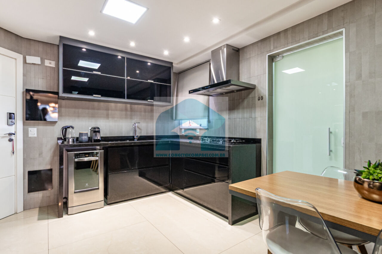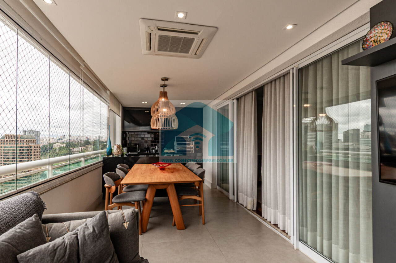 Estantes com iluminação em LED. . 2 splits ar condicionado espelhado . Papel de parede e espelhos. Infra existente do condomínio para Churrasqueira ( não colocamos a churrasqueira). Iluminação técnica com lâmpadas em LED e pendentes sobre a mesa de jantar.