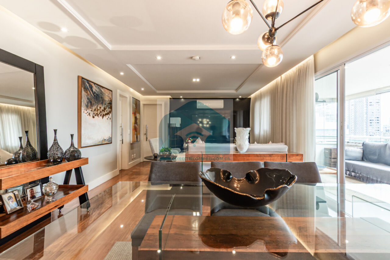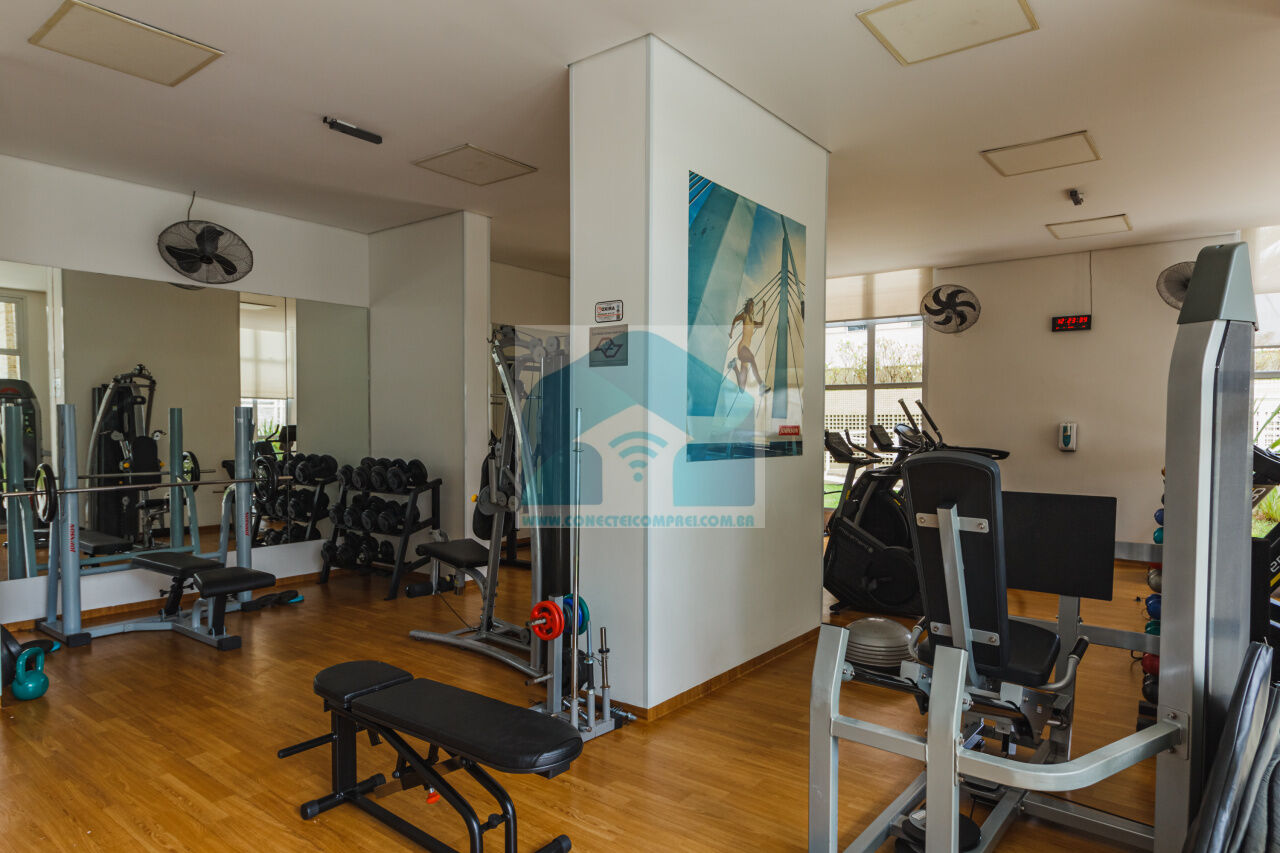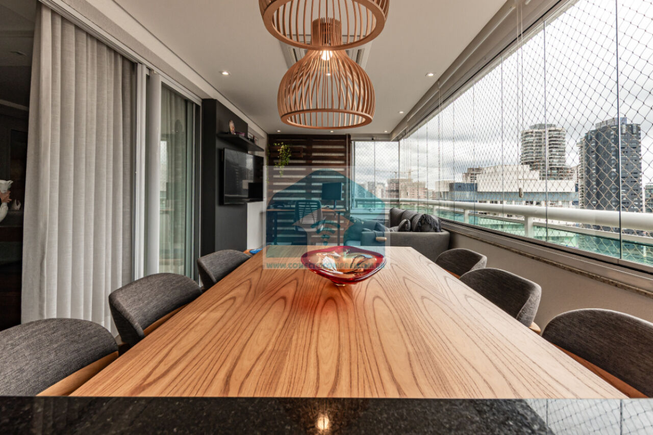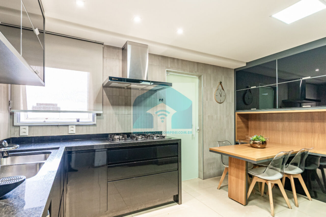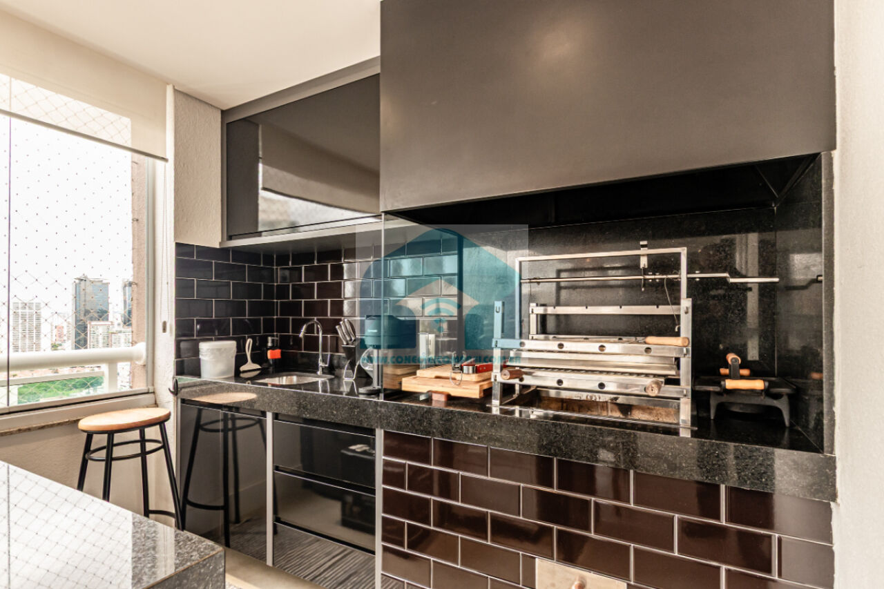 Estantes com iluminação em LED. . 2 splits ar condicionado espelhado . Papel de parede e espelhos. Infra existente do condomínio para Churrasqueira ( não colocamos a churrasqueira). Iluminação técnica com lâmpadas em LED e pendentes sobre a mesa de jantar.