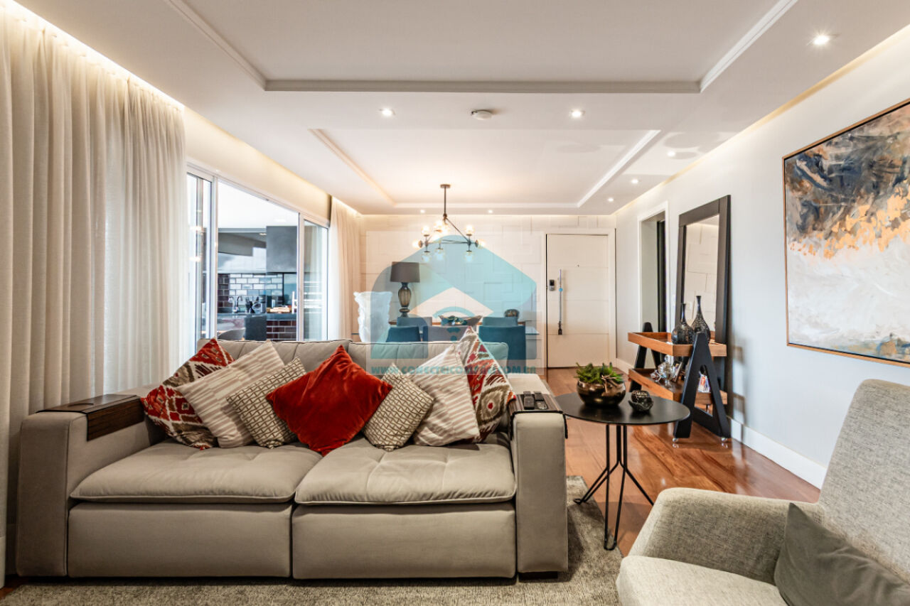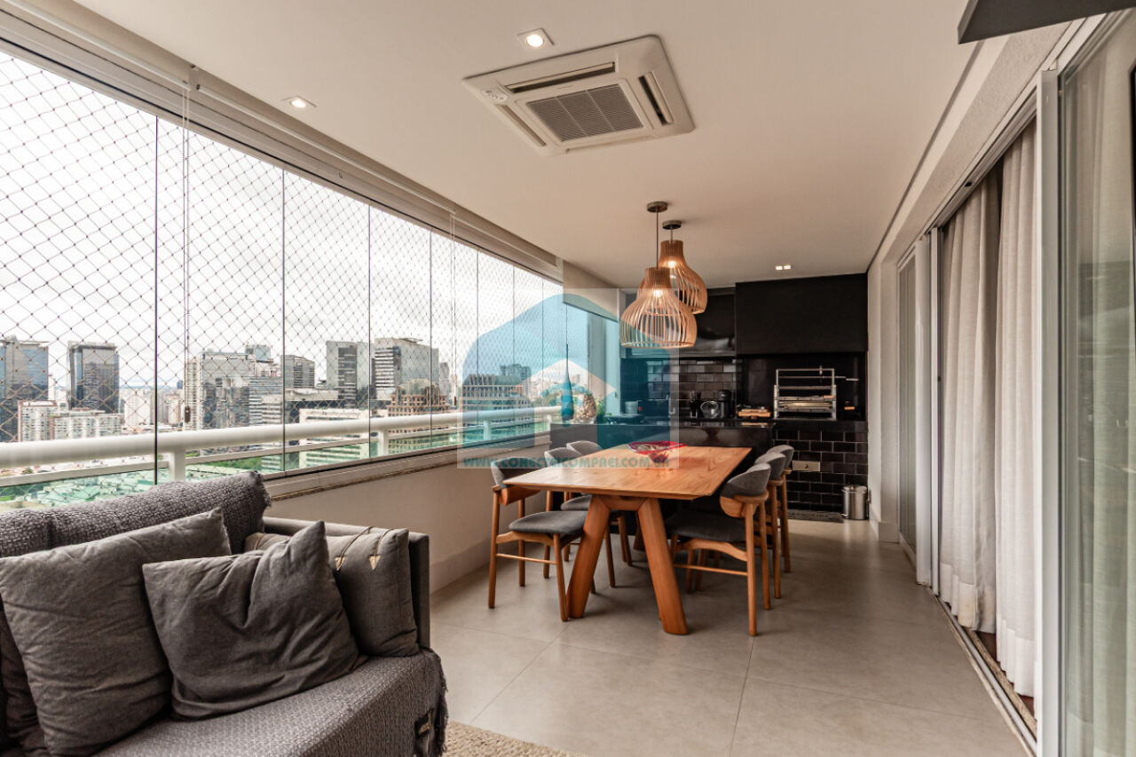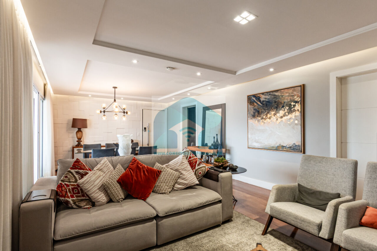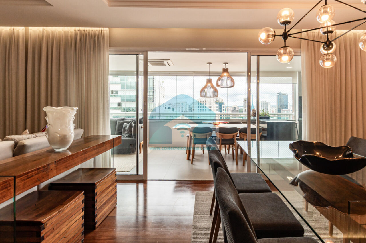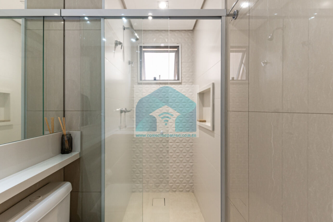 Estantes com iluminação em LED. . 2 splits ar condicionado espelhado . Papel de parede e espelhos. Infra existente do condomínio para Churrasqueira ( não colocamos a churrasqueira). Iluminação técnica com lâmpadas em LED e pendentes sobre a mesa de jantar.