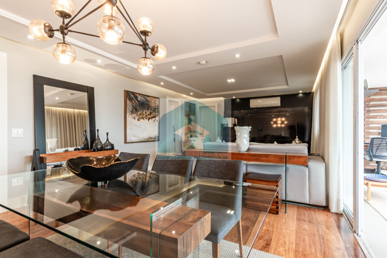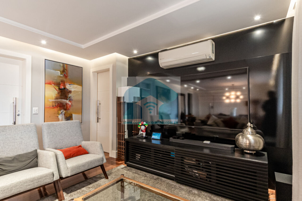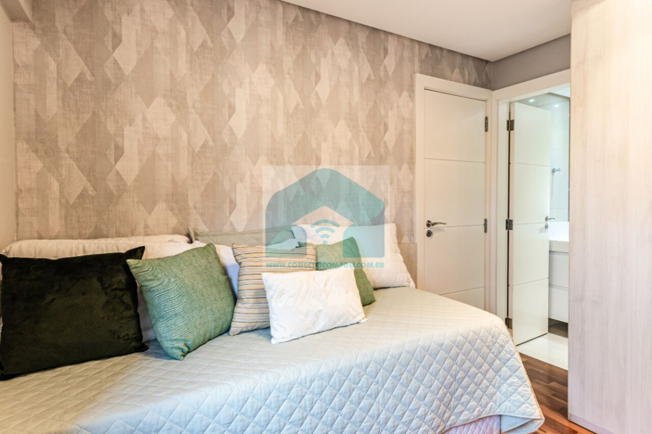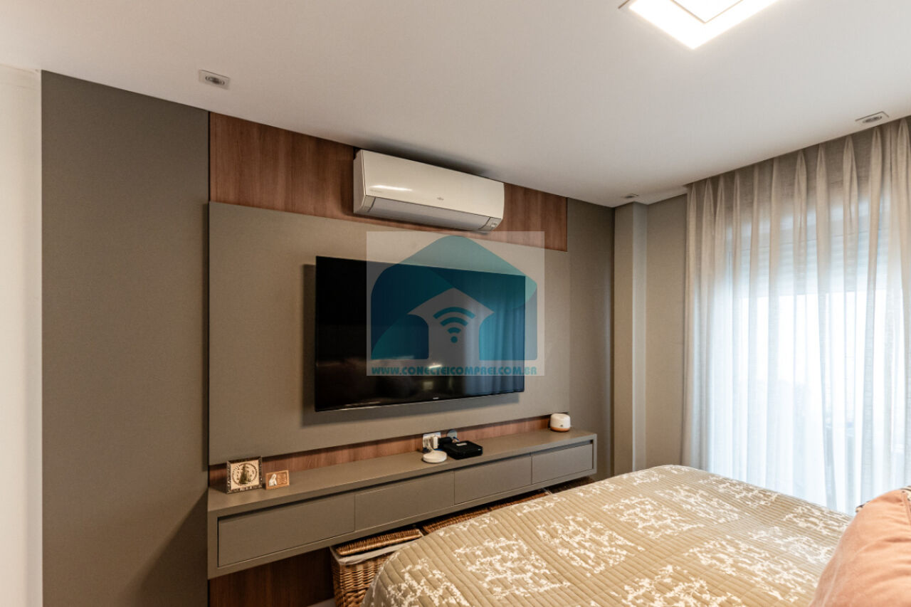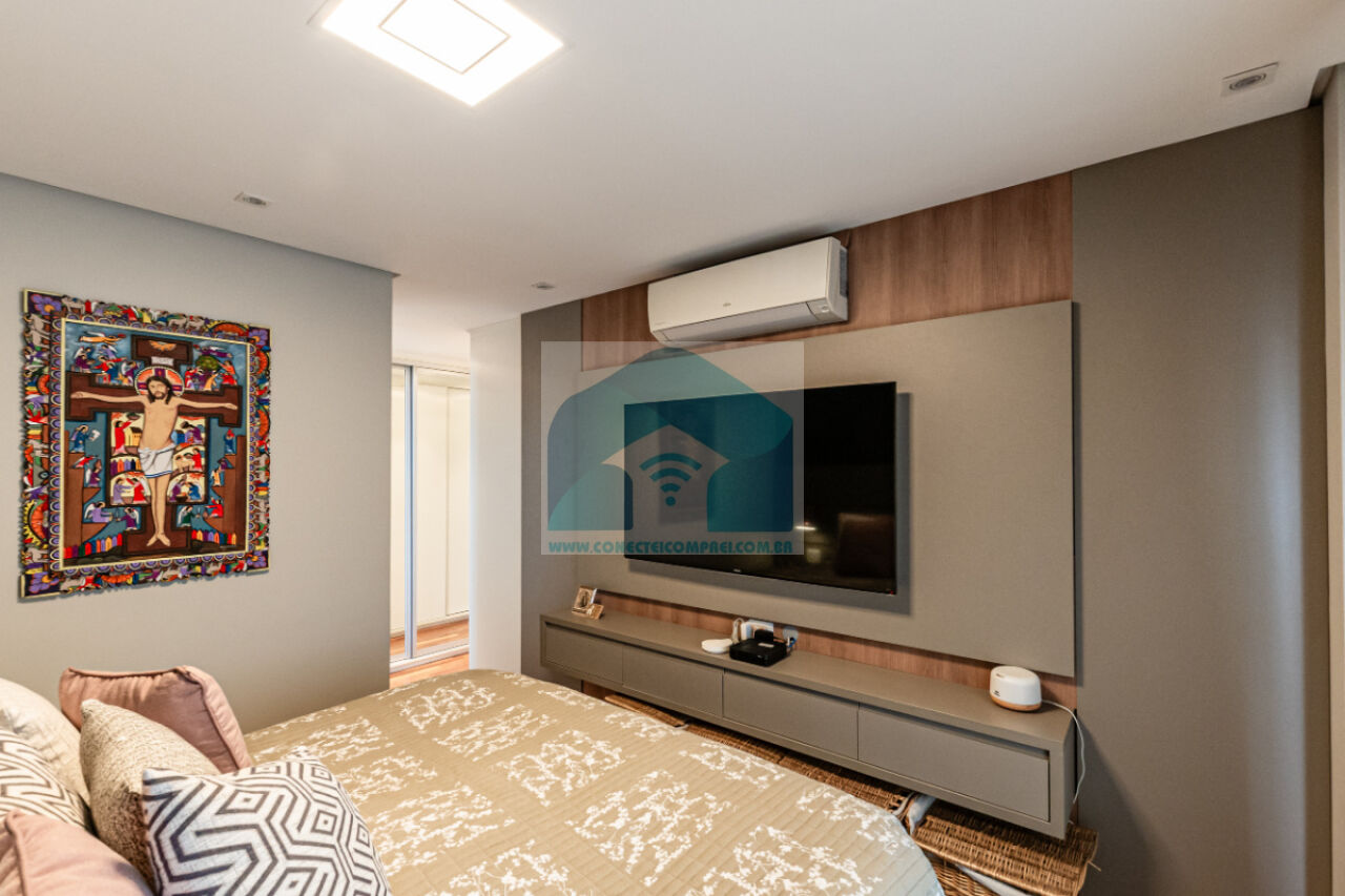 (4) suíte master - piso em madeira estruturado Hakwood Carvalho europeu. Cômoda com tampo e laterais em couro natural,. Cama queen size (colchão não incluso) com cabeceira em couro natural e painel de fundo em marcenaria , 2 mesas de cabeceiras. TV Sony 55 pol. Painel da TV em couro. Cortina uniflex não motorizada. Ar condicionado split espelhado. Papel de parede e espelhos. Iluminação técnica com lâmpadas em LED.