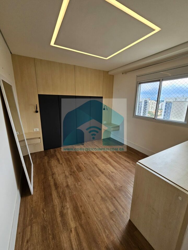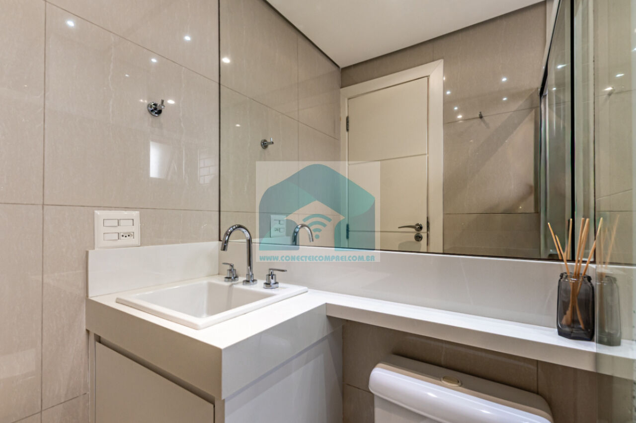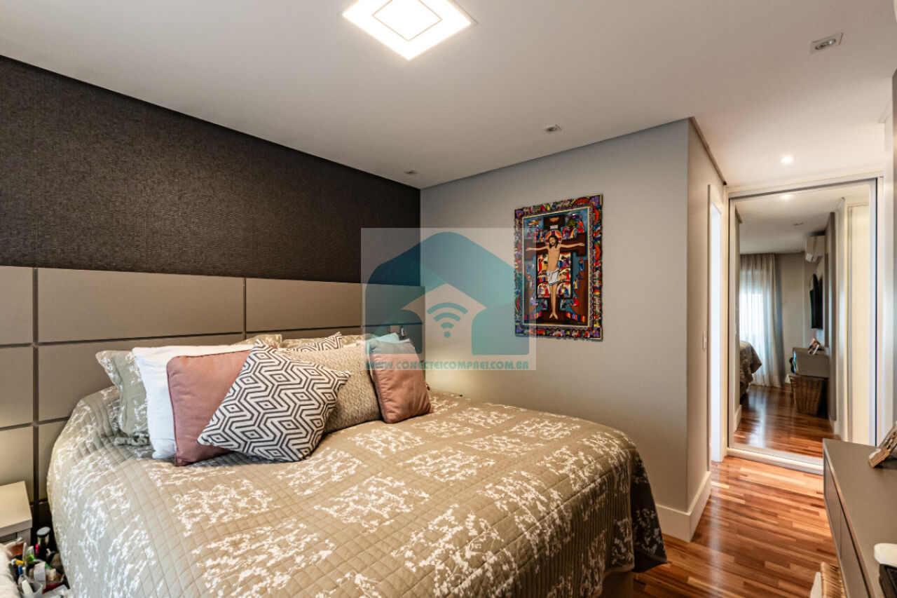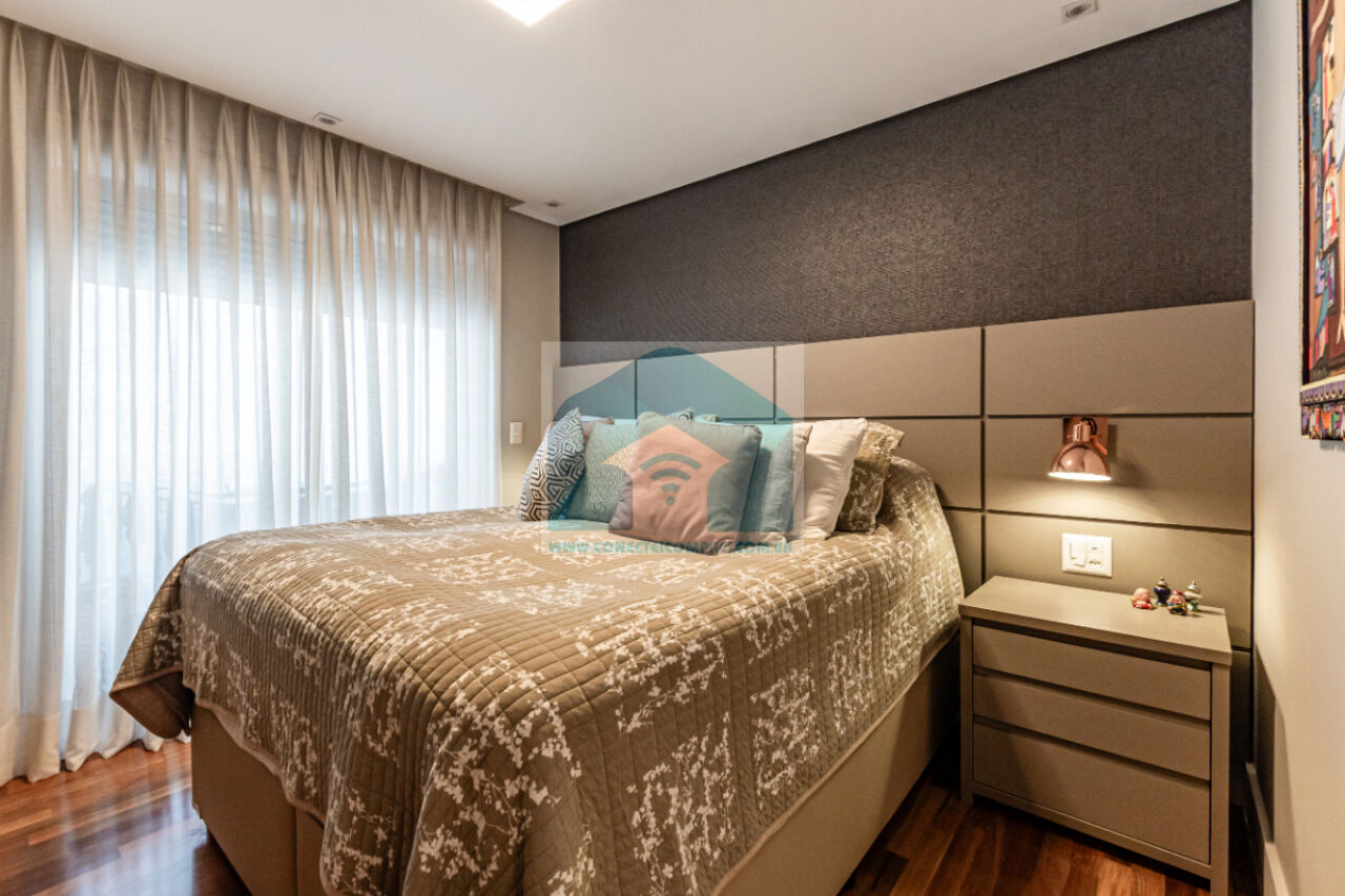 (4) suíte master - piso em madeira estruturado Hakwood Carvalho europeu. Cômoda com tampo e laterais em couro natural,. Cama queen size (colchão não incluso) com cabeceira em couro natural e painel de fundo em marcenaria , 2 mesas de cabeceiras. TV Sony 55 pol. Painel da TV em couro. Cortina uniflex não motorizada. Ar condicionado split espelhado. Papel de parede e espelhos. Iluminação técnica com lâmpadas em LED.