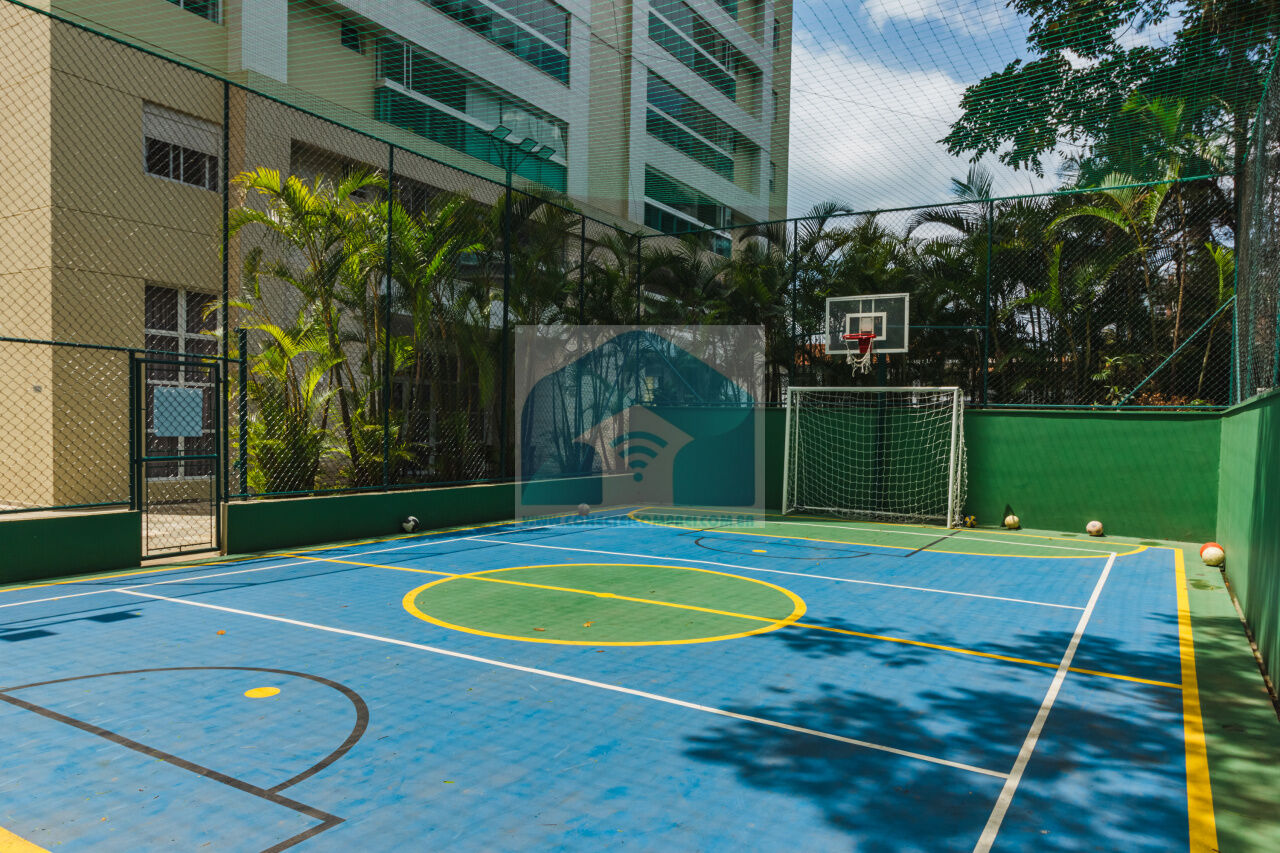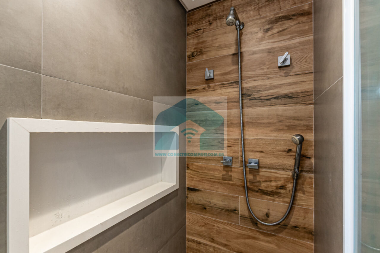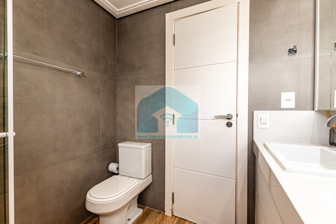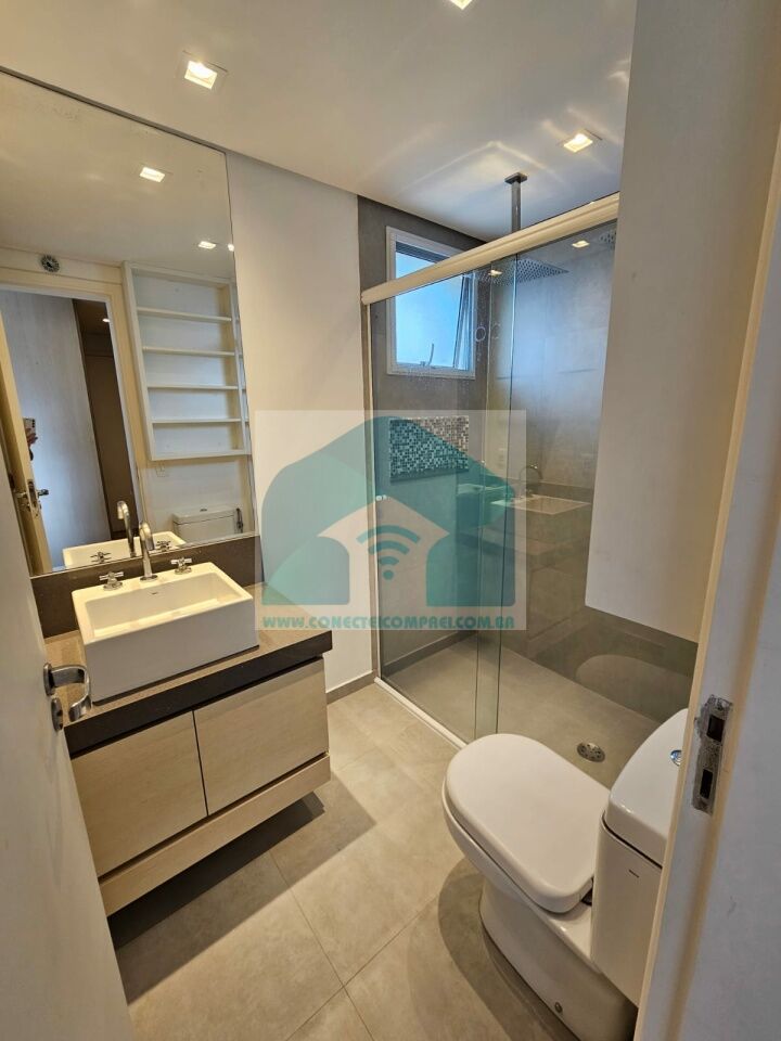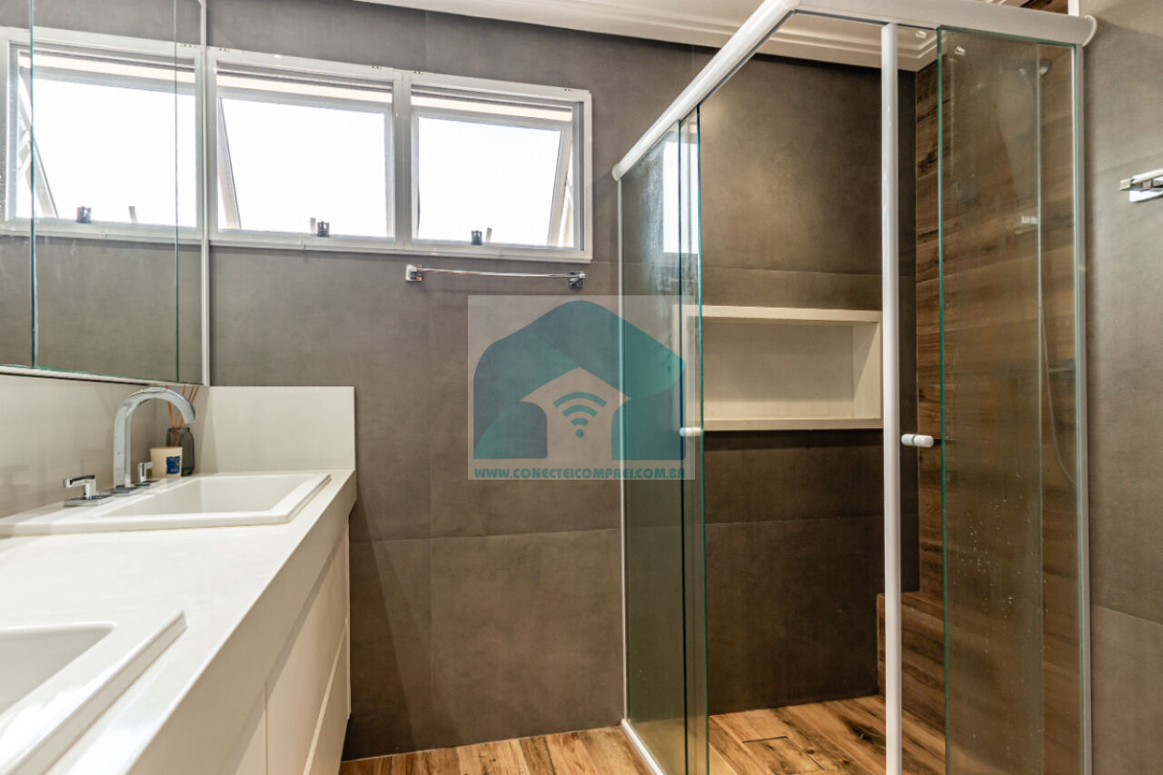 (4) suíte master - piso em madeira estruturado Hakwood Carvalho europeu. Cômoda com tampo e laterais em couro natural,. Cama queen size (colchão não incluso) com cabeceira em couro natural e painel de fundo em marcenaria , 2 mesas de cabeceiras. TV Sony 55 pol. Painel da TV em couro. Cortina uniflex não motorizada. Ar condicionado split espelhado. Papel de parede e espelhos. Iluminação técnica com lâmpadas em LED.