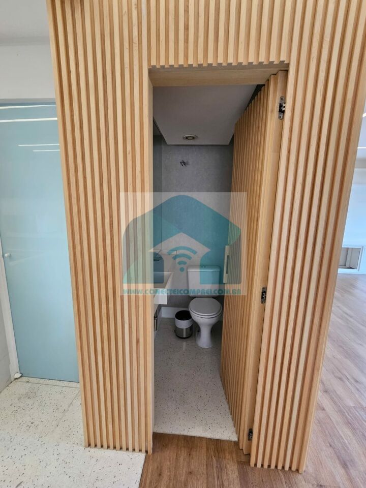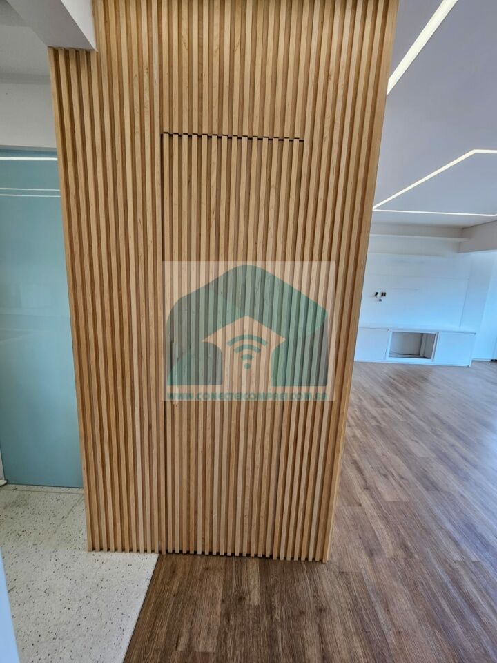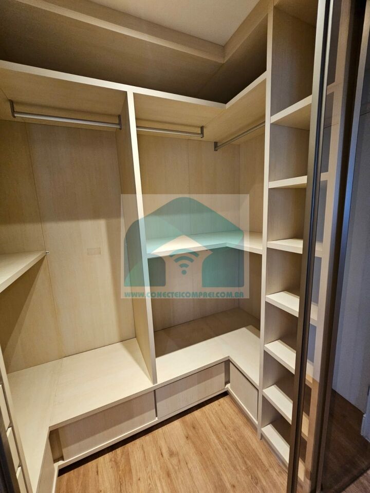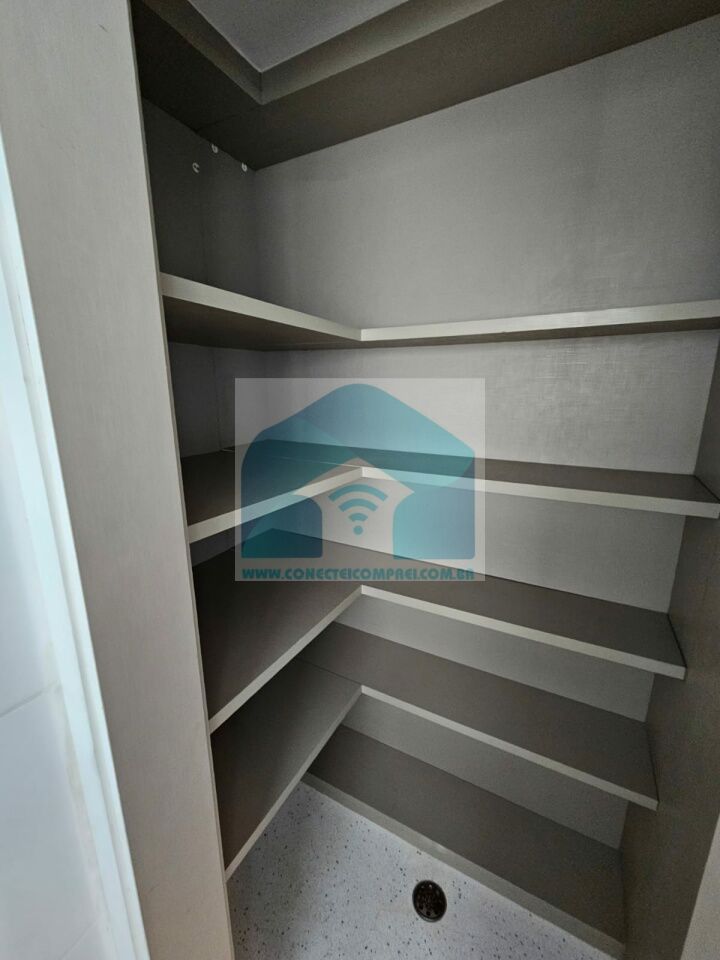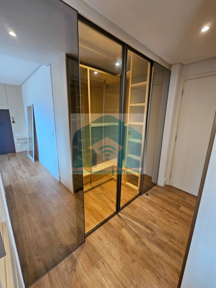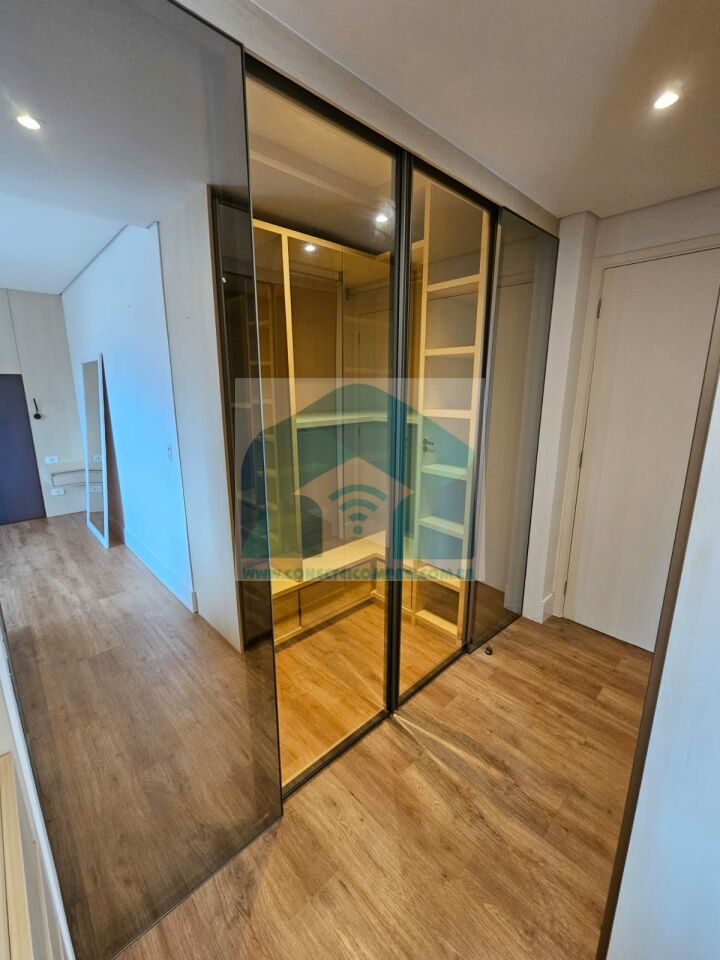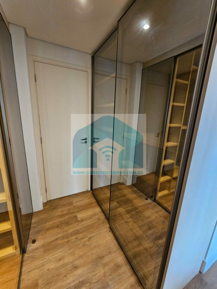 Closet em marcenaria com porta e painel em espelho (ambos os lados) e roteador (duplicador de sinal).