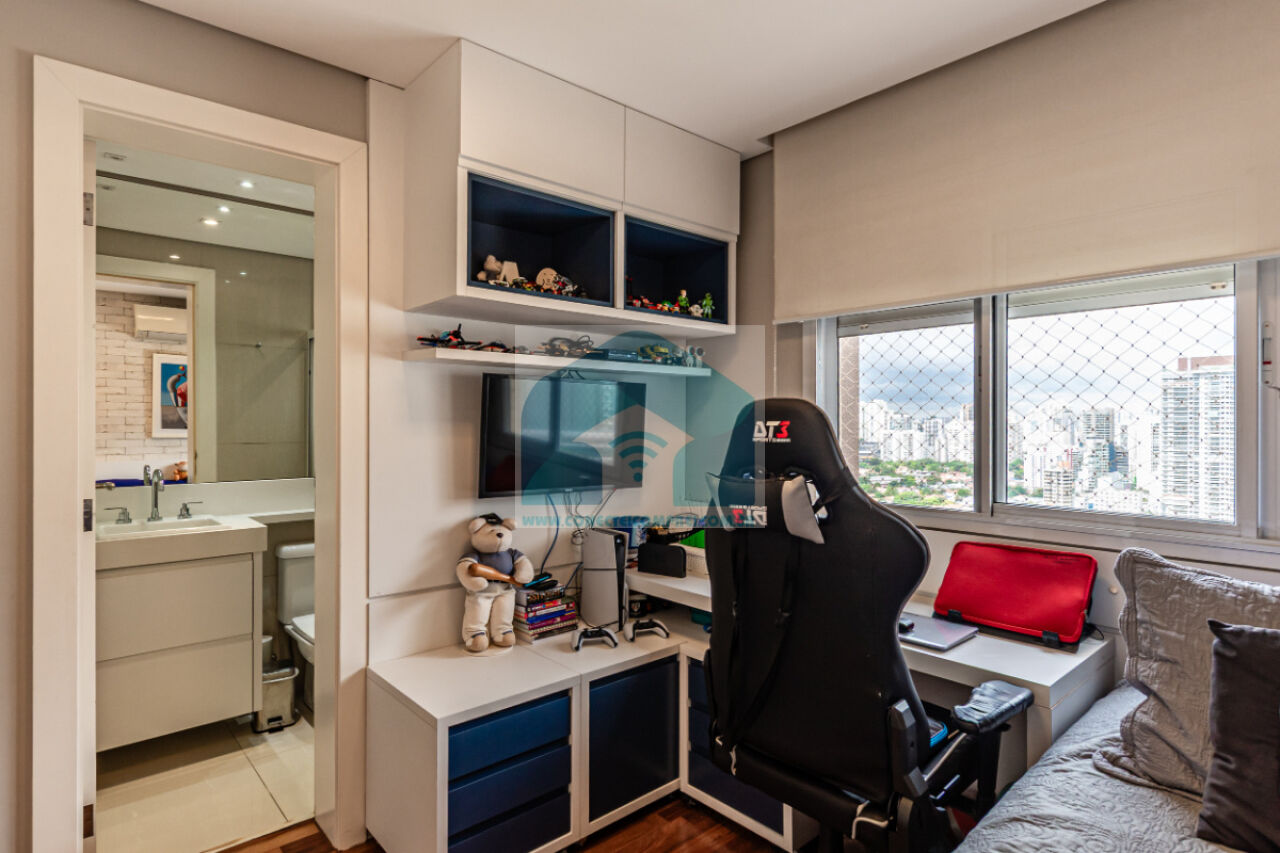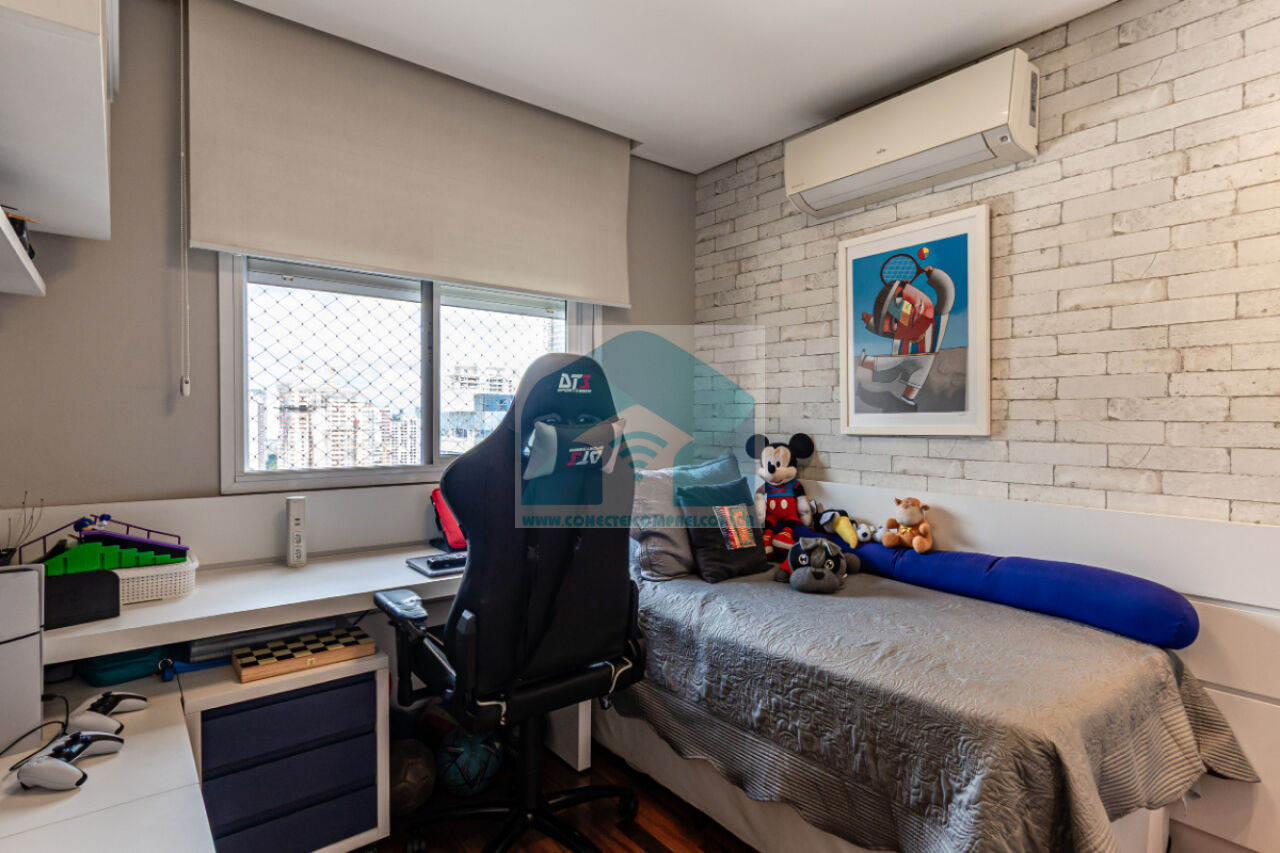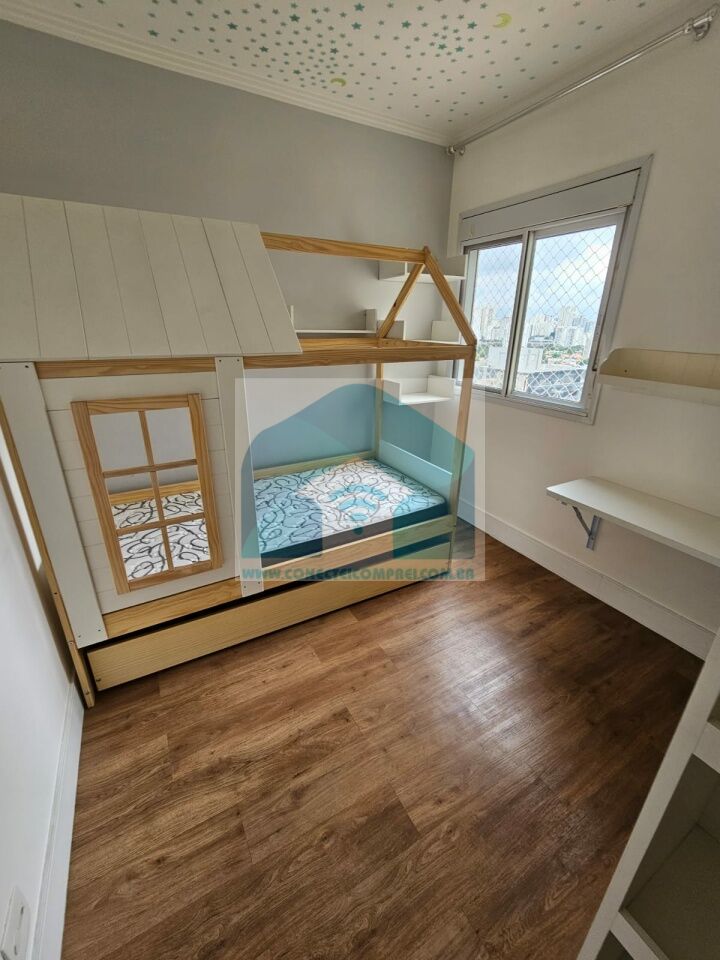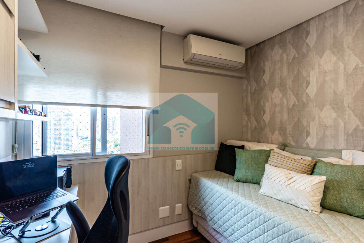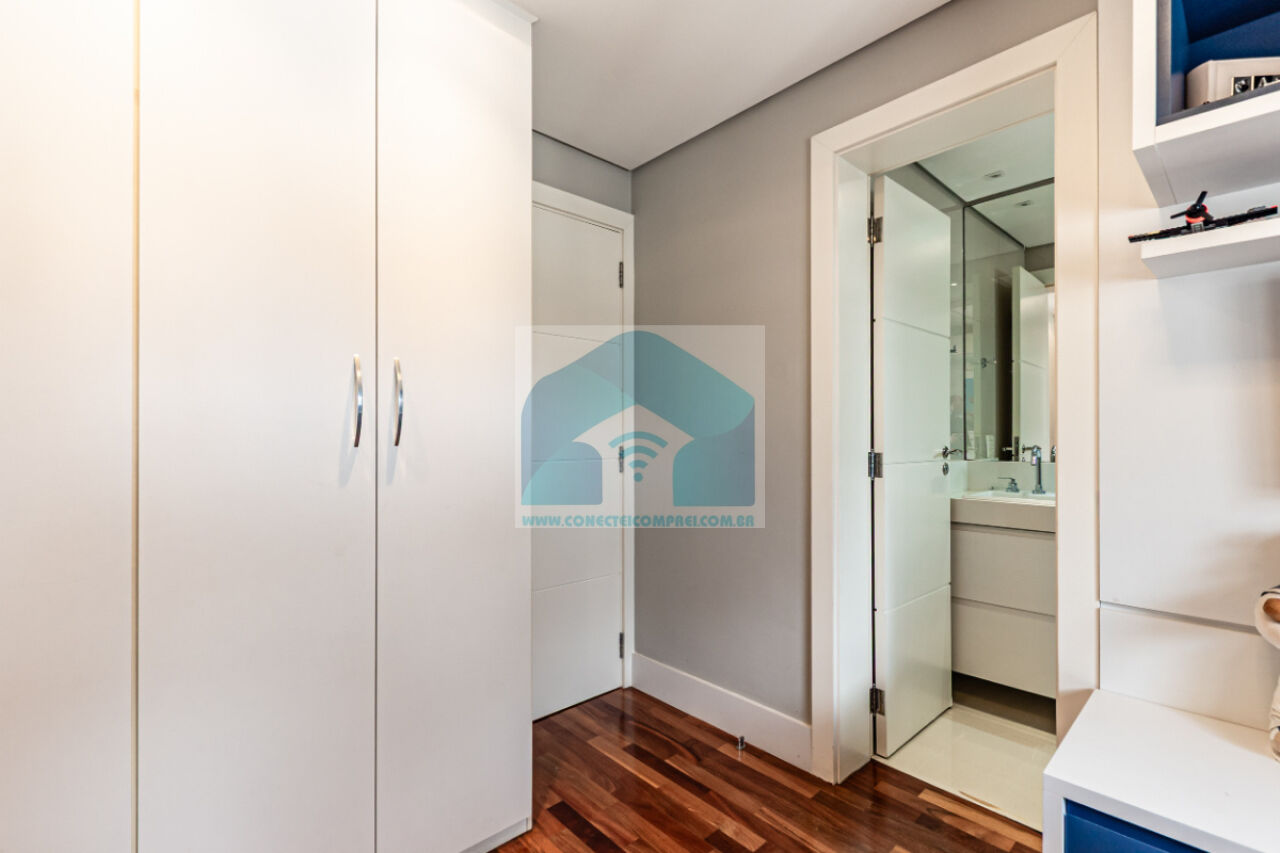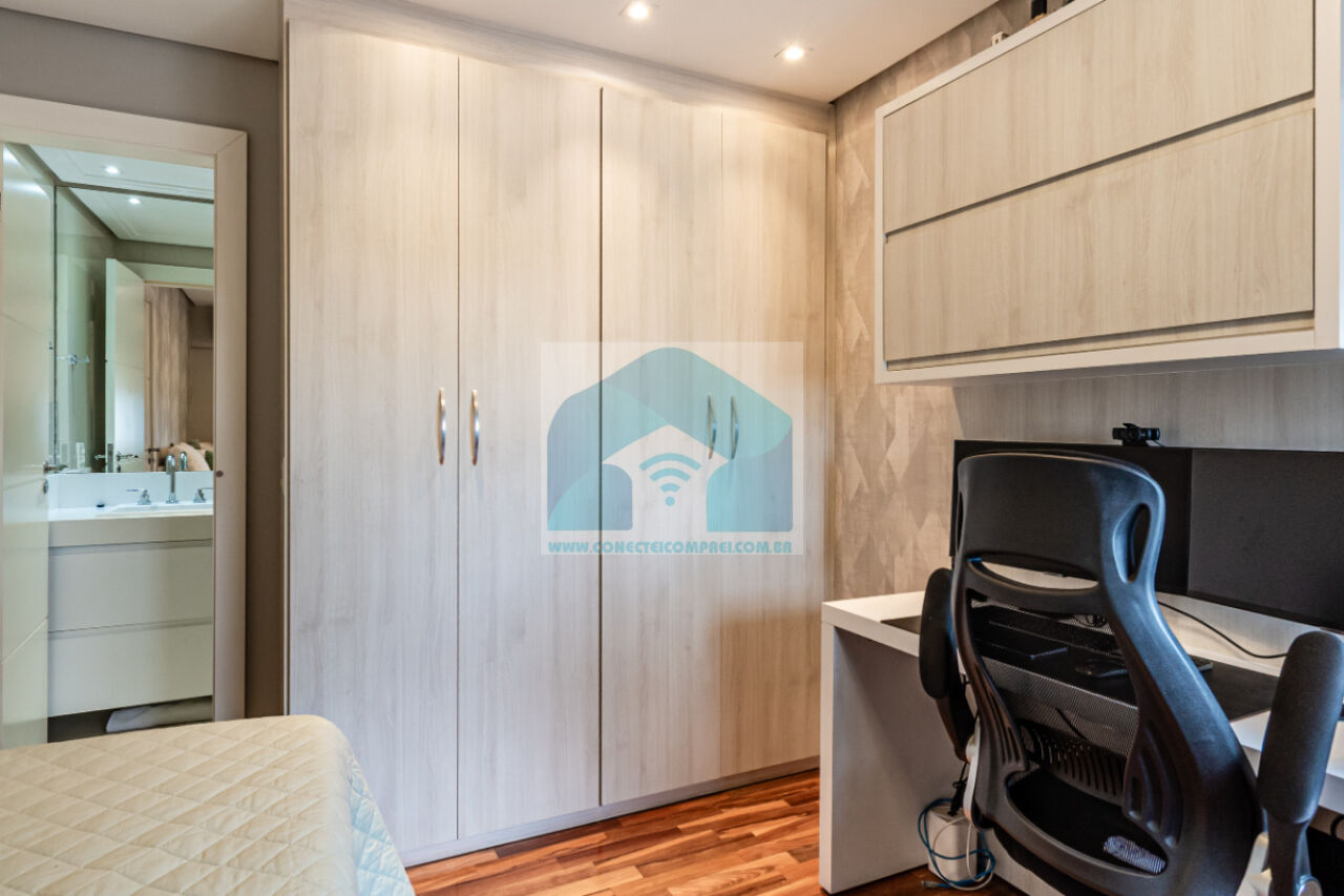 (3) 2 suítes crianças - piso em madeira estruturada Hakwood Carvalho europeu, armários e prateleira marcenaria. Cortinas uniflex não motorizada. Ar condicionado split. Papel de parede. Iluminação técnica com lâmpadas em LED.
