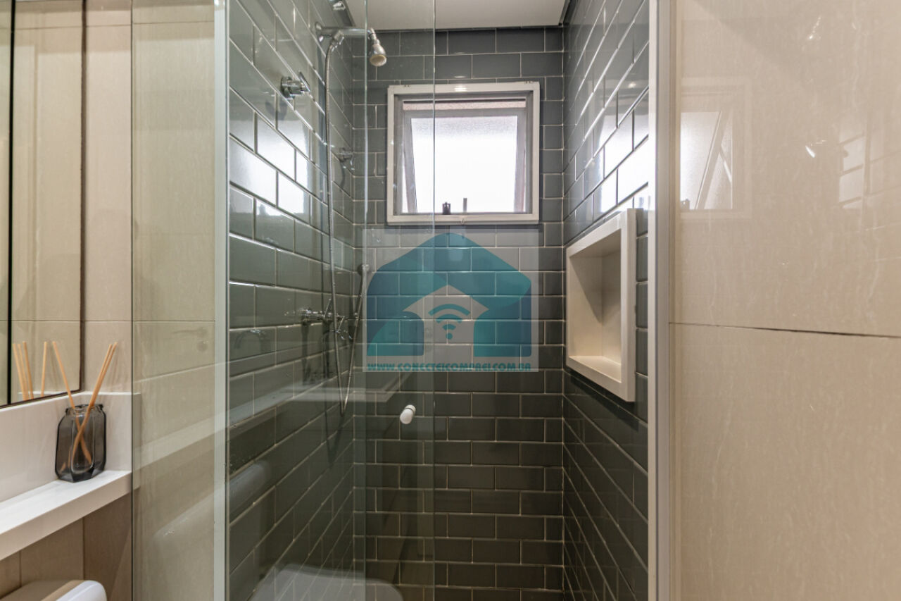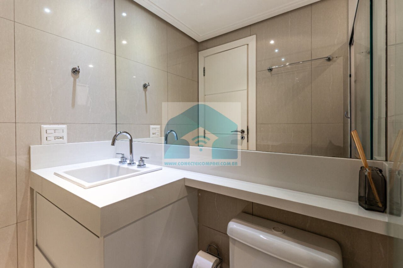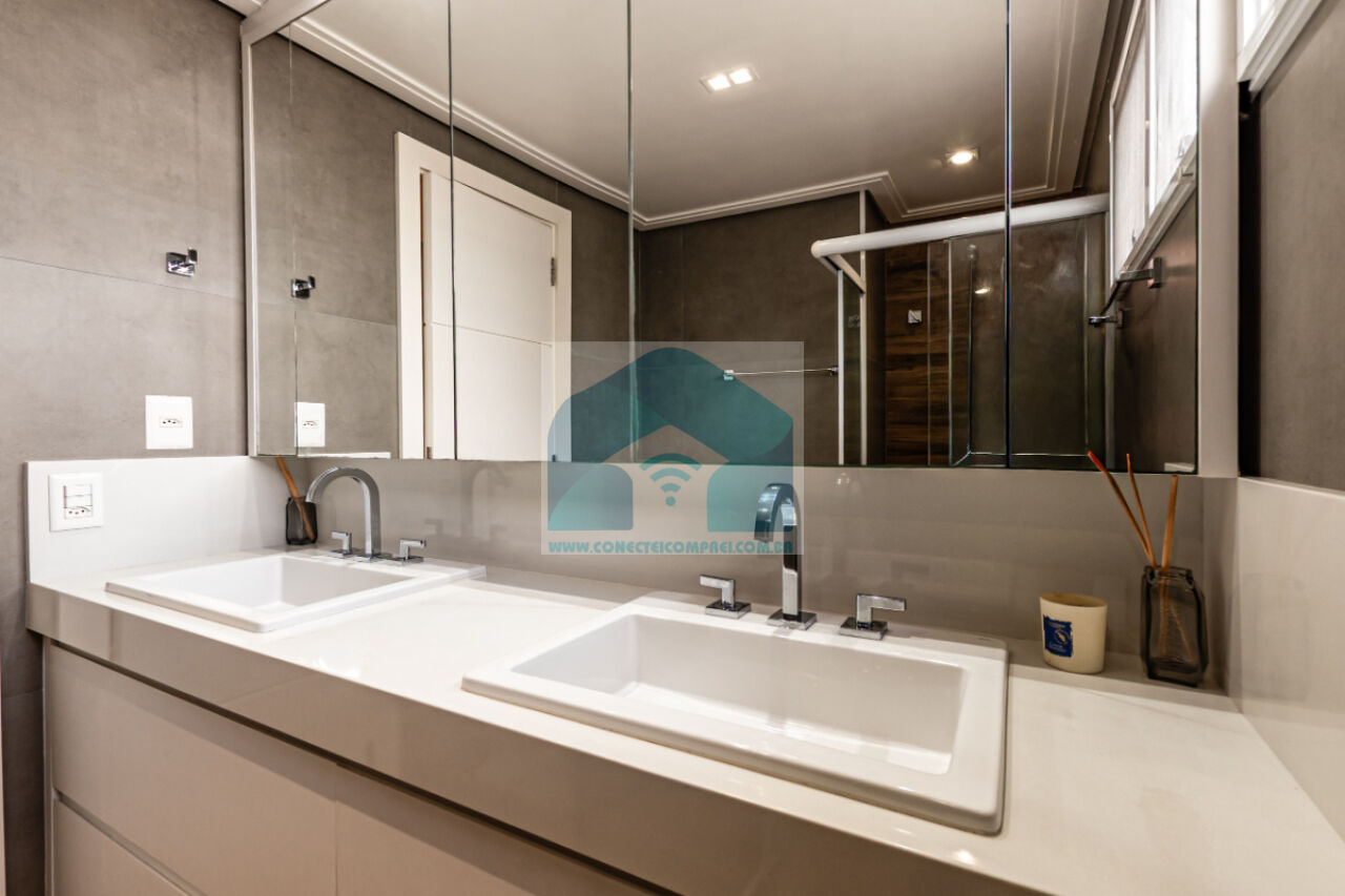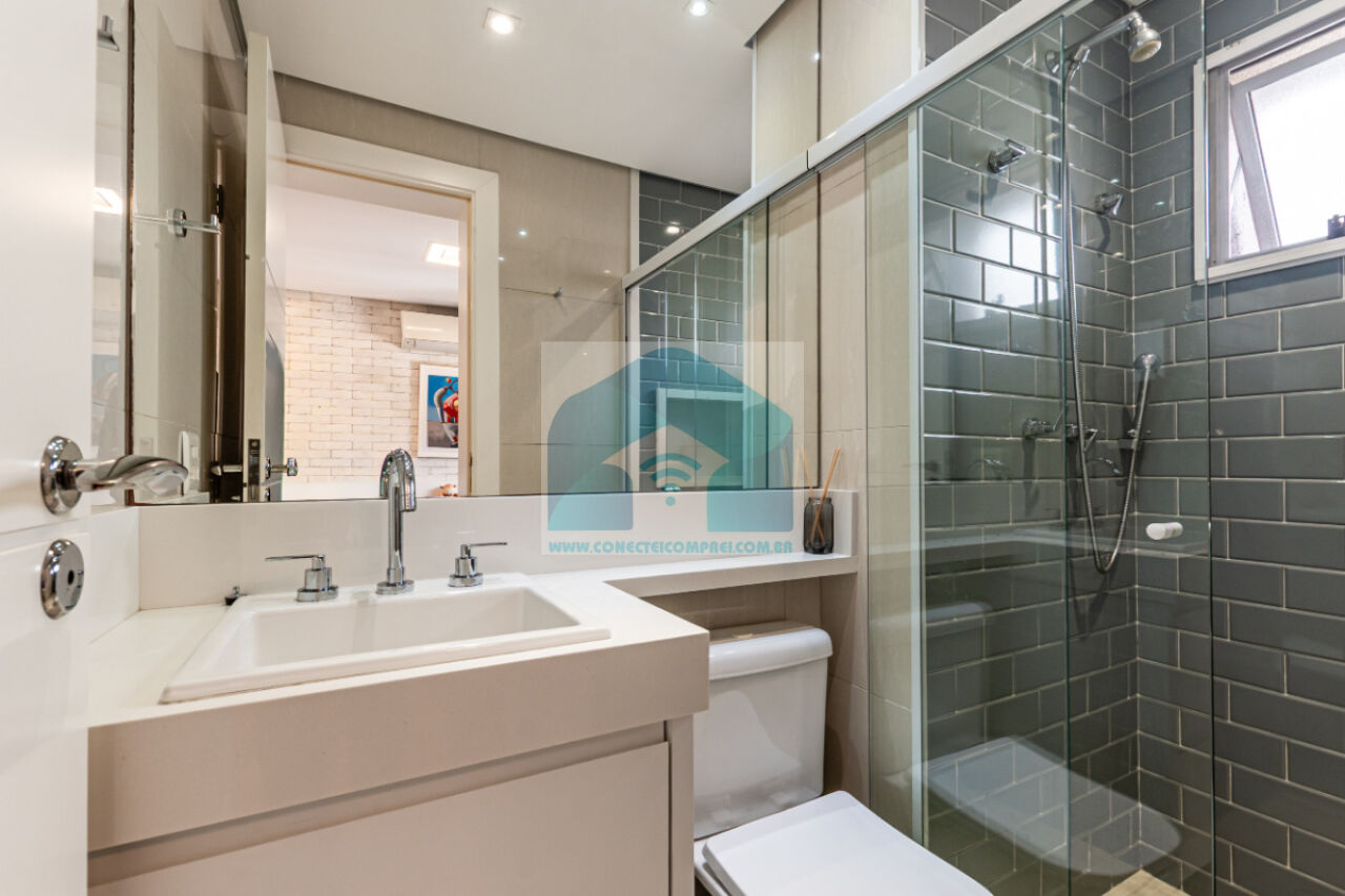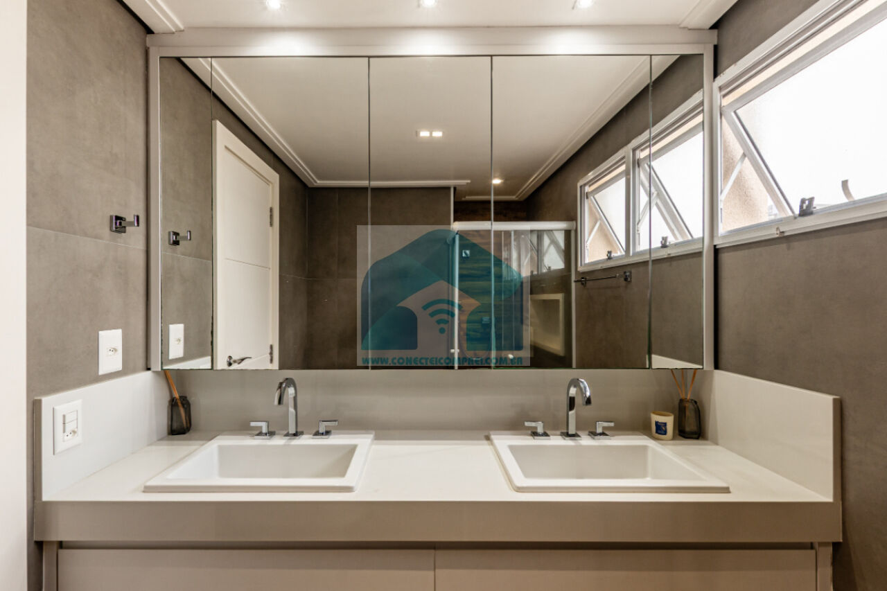 Banheiros revestidos em porcelanato com armários em marcenaria, tampos em silestone, metais hansgrohe e acessórioss axor. Bacia sanitária com caixa acoplada deca. Iluminação técnica com lâmpadas em LED . Box e espelho.