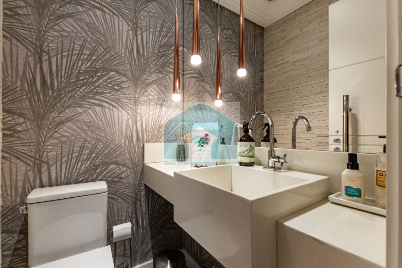 (5) lavabo - Banheiro com tampo com Cuba esculpida em Dekton, saia do tampo em marcenaria e metais hansgrohe e acessórios axor. Bacia sanitária com caixa acoplada deca. Espelho iluminação em LED. Iluminação técnica em LED.